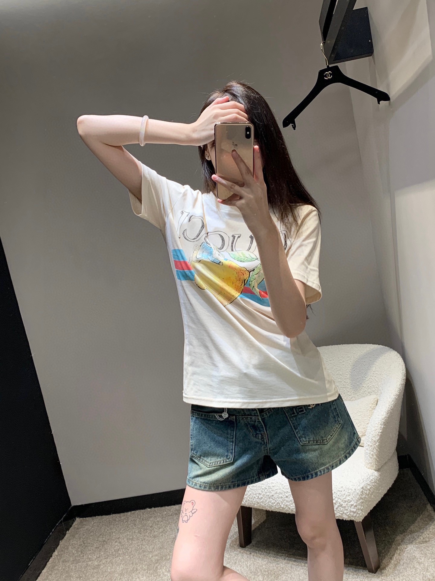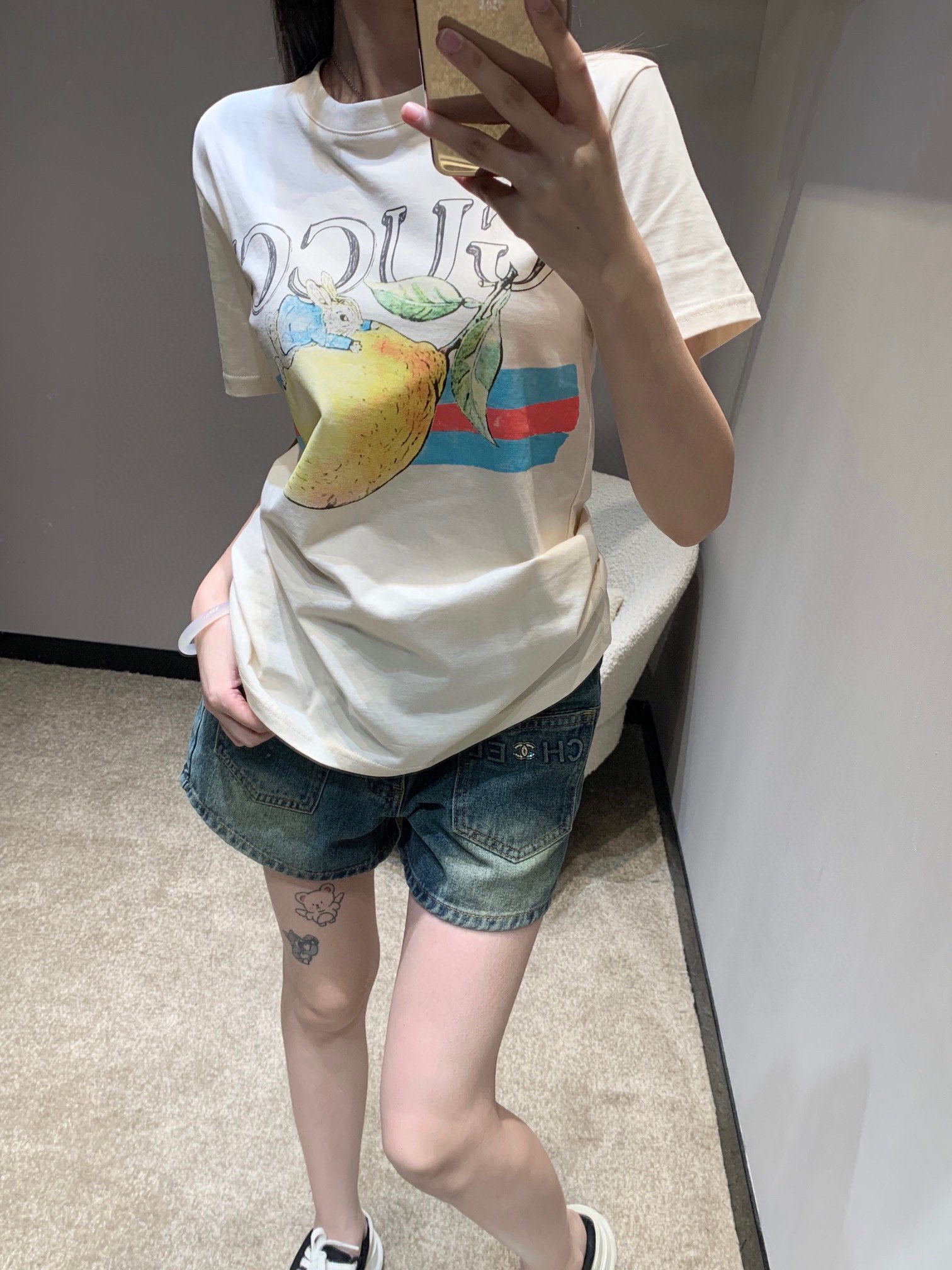 鏡の前で撮る自撮りショットが紡ぎ出す、グッチ コピー空気感あふれるファッション。その中心に輝くのが、GUCCI のヴィンテージ風プリント T シャツだ。ミルクホワイトの柔らかな質感、カラフルでノスタルジックなグラフィック、そしてブランドならではの洗練された雰囲気が、シンプルなコーディネートを “特別な 1 枚” へと昇華させる。