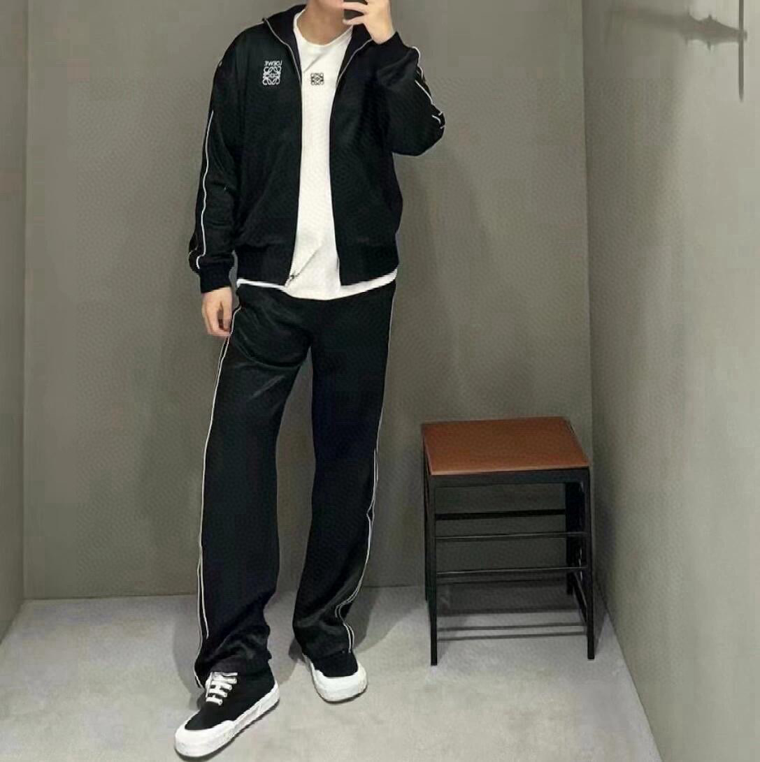 スウェットセットの強みは、「一貫性のあるルック」を瞬時に完成させる力 にある。画像のようにセットで着れば、ヴィンテージスポーツのルックがそのままに、LOEWE ならではの洗練された雰囲気を放つ。一方、ジャケット単体でデニムやレザーパンツと組み合わせれば、「ストリート感」から「ビジネスカジュアル」まで、幅広いシーンに適応する。小物との相性も圧倒的。クリーンなホワイトスニーカーでカジュアルさを強調し、レザーベルトや高級感のあるバッグを加えれば、都市的なエレガンスへと変貌する。