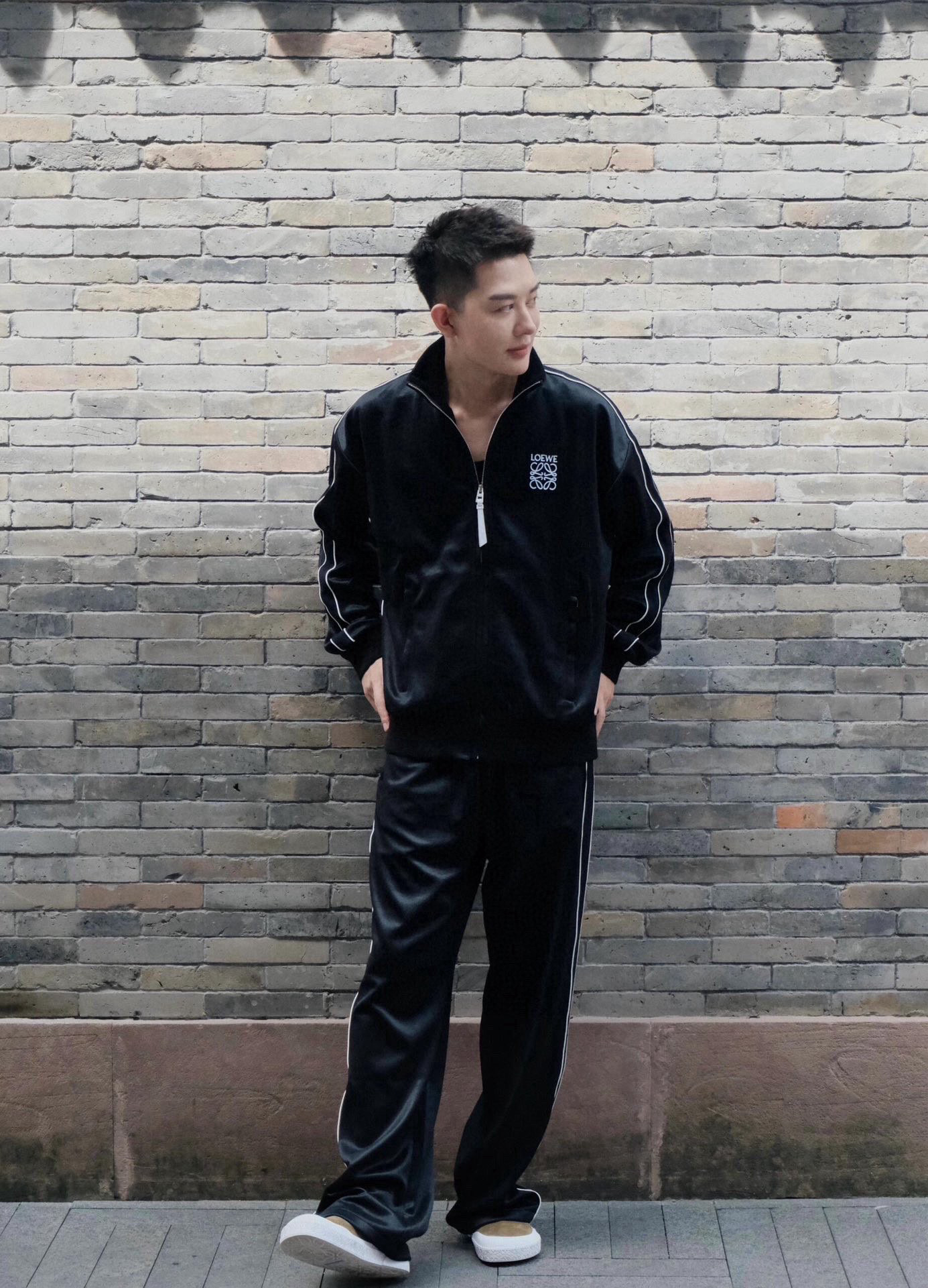 レンガ壁の質感と対比する、漆黒のスウェットセット。ロエベ スーパーコピー胸元に配されたLOEWE のアナグラムロゴと、白いパイピングが描くラインが、ヴィンテージスポーツのルーツとハイファッションの美意識を融合させる。このセットは、「カジュアルながらも高級感」を体現する LOEWE の哲学を具象化し、日常の装いに「ルックの完成度」と「着心地の極致」を両立させる。