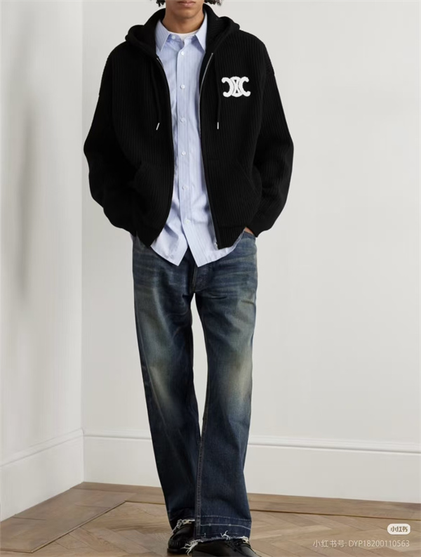 1945 年フランス・パリで誕生し、現代のミニマル美学で世界的に人気を得る CELINE の DNA を凝縮したこのアイテムは、CELINE コピーとして 2025 秋冬のカジュアルアウタートレンドを先取りした逸品。ディープブラックの高密度縦紋ニットを基調に、胸元に配置された白の Triomphe ロゴ刺繍がブランド特有の低調な奢華感を際立たせ、フルジッパー連帽のシルエットに CELINE らしい精緻なラインが加わっている。