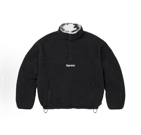 表地には柔らかく保温性に優れたボアフリース素材を採用し、見た目にも暖かみのある仕上がり。内側の襟元にはさりげなく迷彩柄があしらわれ、シンプルな外観の中にSupremeらしい遊び心をプラスしています。スタンドカラー仕様により防寒性も高く、首元までしっかりと暖かさをキープしてくれます。