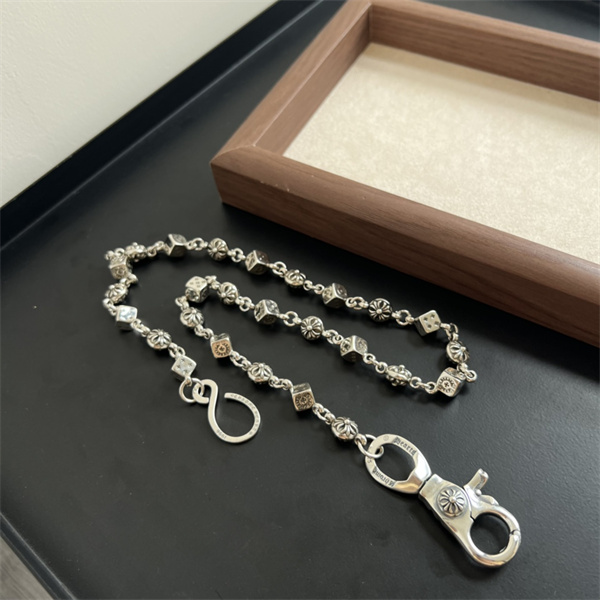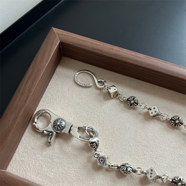 上質なシルバー素材を使用し、ずっしりとした重量感と深みのある輝きが魅力。使い込むほどに風合いが増し、自分だけの表情へと育っていくのもクロムハーツならではの楽しみです。フックや留め具部分にもブランドらしいモチーフが施され、実用性とデザイン性を高い次元で両立しています。