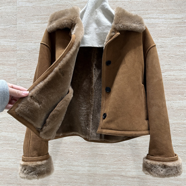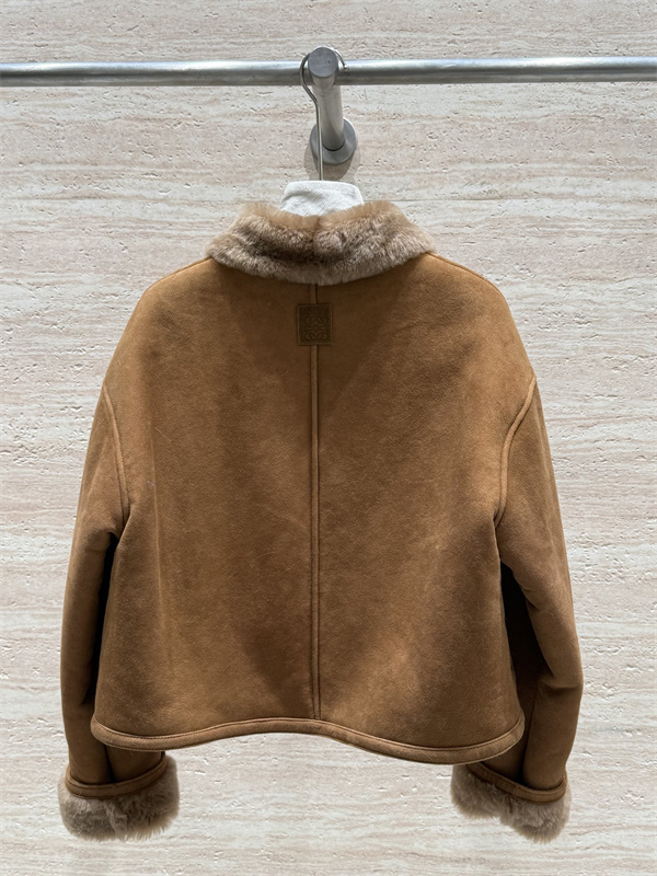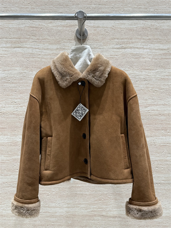 こちらのLOEWE ロエベ コピーアイテムは、上質なスエード調素材と柔らかなファーカラーを組み合わせた、クラシックな雰囲気漂うショートジャケットです。温かみのあるブラウンカラーを基調とし、襟元と袖口にあしらわれたファーが、全体に優雅で落ち着いた印象を与えます。シンプルなデザインの中に、ロエベらしい洗練と上質感が感じられる一着です。