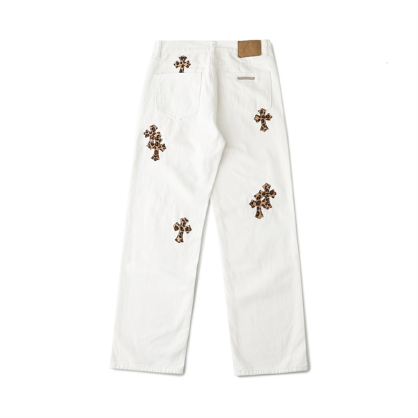 大胆に施されたロゴプリントとクロスモチーフのパッチデザインが印象的な、クロムハーツ コピー デニムパンツ。ホワイトデニムをベースに、カラフルなグラフィティ風ロゴとレオパード柄クロスがアクセントとなり、ストリート感とラグジュアリーな雰囲気を絶妙に融合させています。シンプルなトップスと合わせるだけでコーディネートの主役になる、インパクト抜群の一本です。