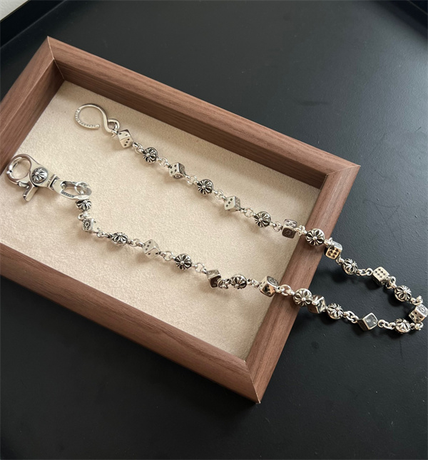 上質なシルバー素材を使用し、ずっしりとした重量感と深みのある輝きが魅力。使い込むほどに風合いが増し、自分だけの表情へと育っていくのもクロムハーツならではの楽しみです。フックや留め具部分にもブランドらしいモチーフが施され、実用性とデザイン性を高い次元で両立しています。