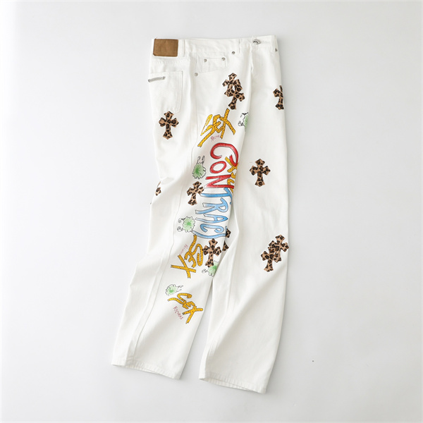 大胆に施されたロゴプリントとクロスモチーフのパッチデザインが印象的な、クロムハーツ コピー デニムパンツ。ホワイトデニムをベースに、カラフルなグラフィティ風ロゴとレオパード柄クロスがアクセントとなり、ストリート感とラグジュアリーな雰囲気を絶妙に融合させています。シンプルなトップスと合わせるだけでコーディネートの主役になる、インパクト抜群の一本です。